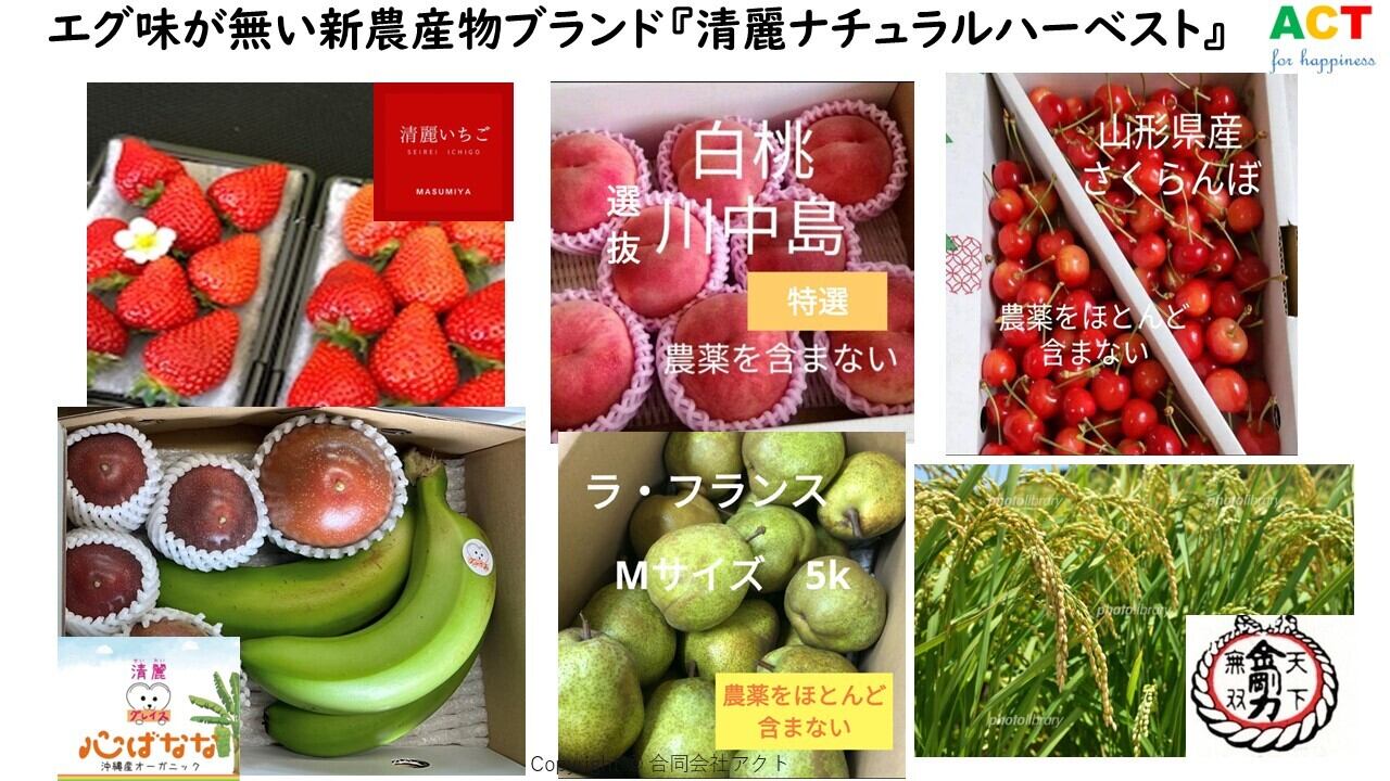 ACT-Gの散布によって、どんな作物でも、エグ味や雑味を抑え、その分、甘みや旨味を強く感じる農産物を作ることが可能となります。共生農業を導入頂いた生産者の皆様と共のに、このエグ味・雑味が無いことで味の差別化をした農産物に『清麗』という共通ブランドを付けて、共生農業でつくられた有機農産物には『清麗オーガニック』、共生農業で一部農薬や化学肥料を使用しながら栽培された農産物には『清麗ナチュラルハーベスト』として市場普及を進めており、水稲、イチゴや桃、バナナ、ホウレンソウ等の『清麗』農産物の仲間を増やしているところです。