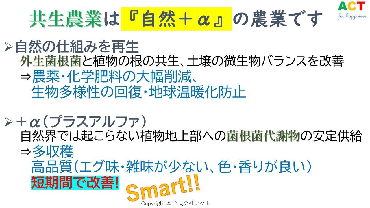 ACT-G(旧称:Smart Max Great Ray)は、共生農業のために次世代炭素循環技術ACTによって開発された持続可能な農業を実現するための液体土壌改良材です。この製品は、自然界での植物と菌根菌の共生環境を模倣し、農業における化学肥料や農薬の使用量を大幅に削減することを目指しています。